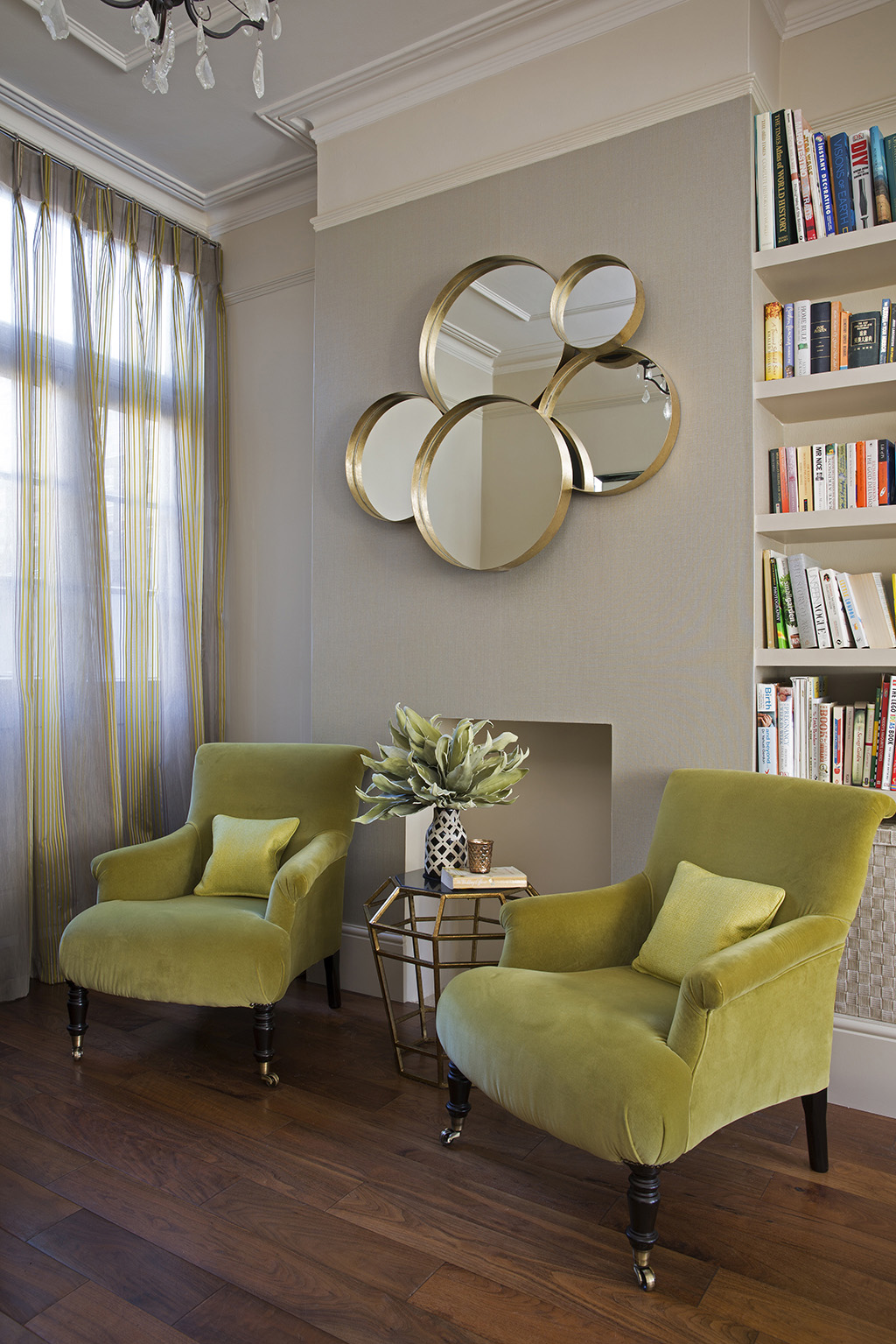 A new piano (not pictured), two gorgeous green velvet armchairs and deep shelves are key features in this client’s tranquil reading/music room